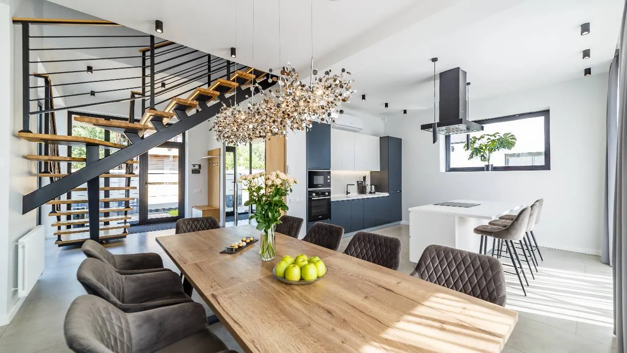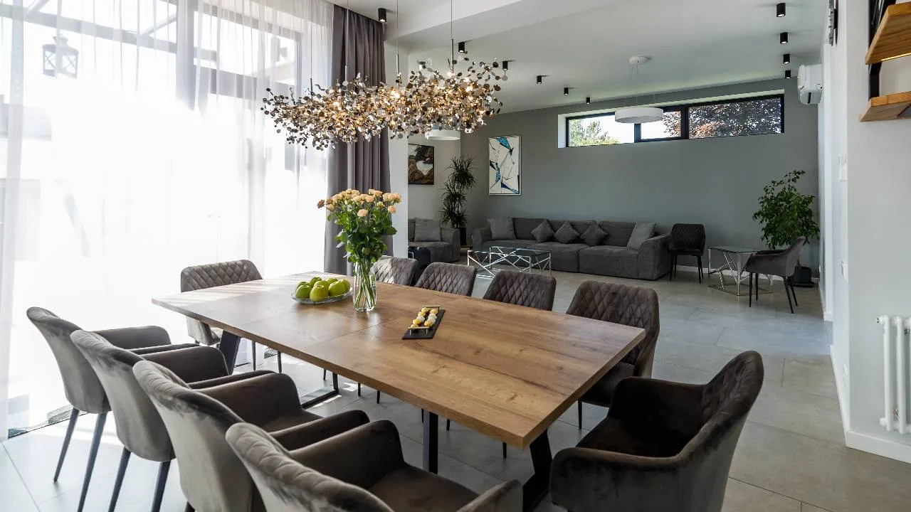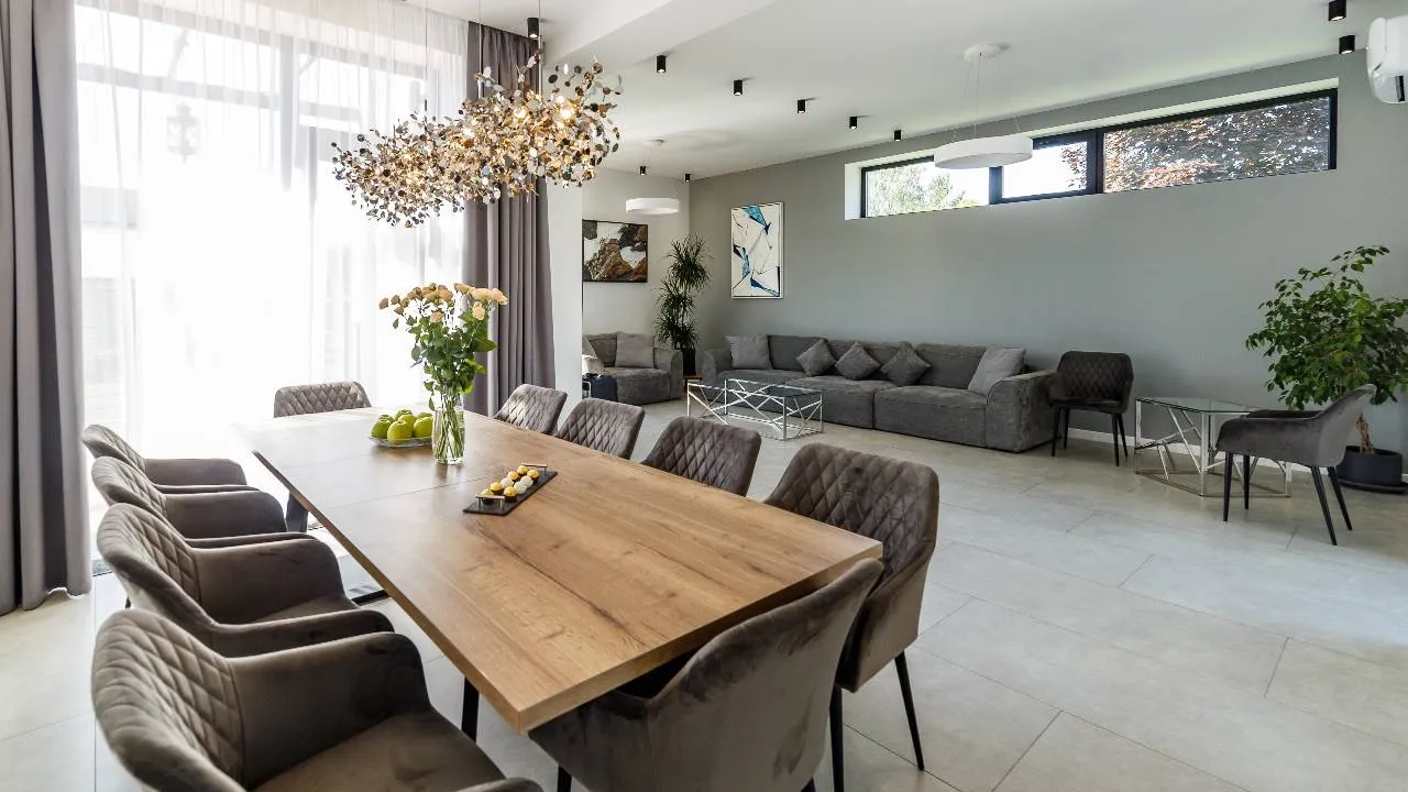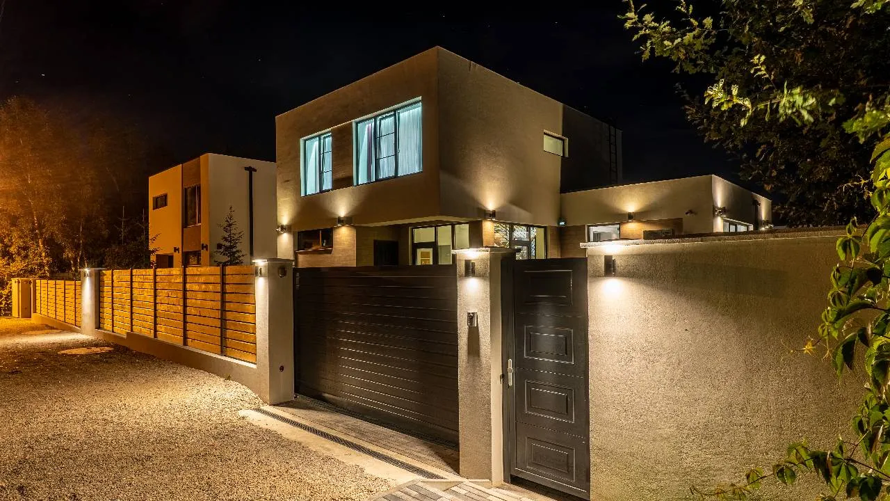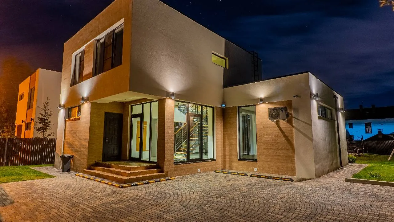 Дом интересен не только с точки зрения архитектуры и дизайна, но и в плане примененных строительных и инженерных технологий. Ленточный фундамент из ФБС-блоков, ж/б плиты перекрытия, армопояс, часть перекрытия из монолита, стены из газобетонных блоков с дальнейшим утеплением и отделкой по фасаду, инженерные системы с применением современных технологий с элементами умного дома. К моменту ввода дома в эксплуатацию уже проведен газ, электрический котел бренда «Buderus» является резервным на случай отключения газового отопления. Мы закупили дополнительную электрическую мощность в размере 25 кВт вдобавок к первоначальным 15 кВт, это обеспечивает надежное энергообеспечение.