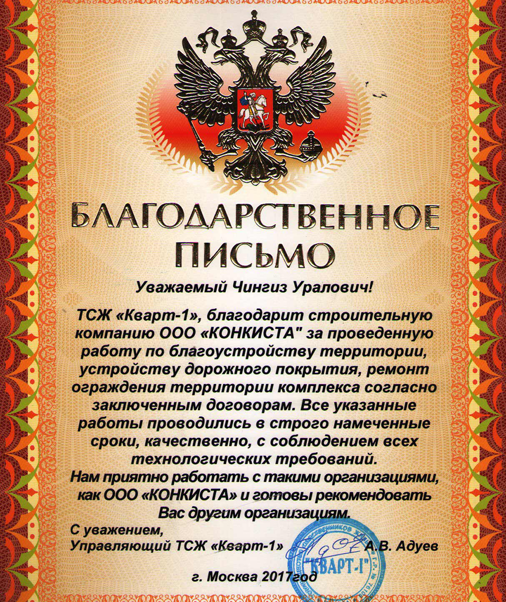 Результатом десятилетней успешной деятельности ГК «Конкиста» стало признание со стороны наших заказчиков и партнеров, подтвержденное многочисленными рекомендательными и благодарственными письмами.